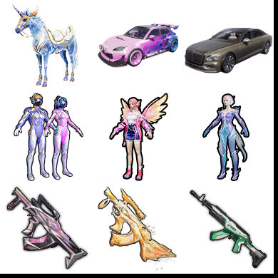 适配系统:安卓 特效枪数量:14 账号类型(腾讯):QQ 载具皮肤:9 套装数量:52 粉装数量:4 枪皮数量:111
