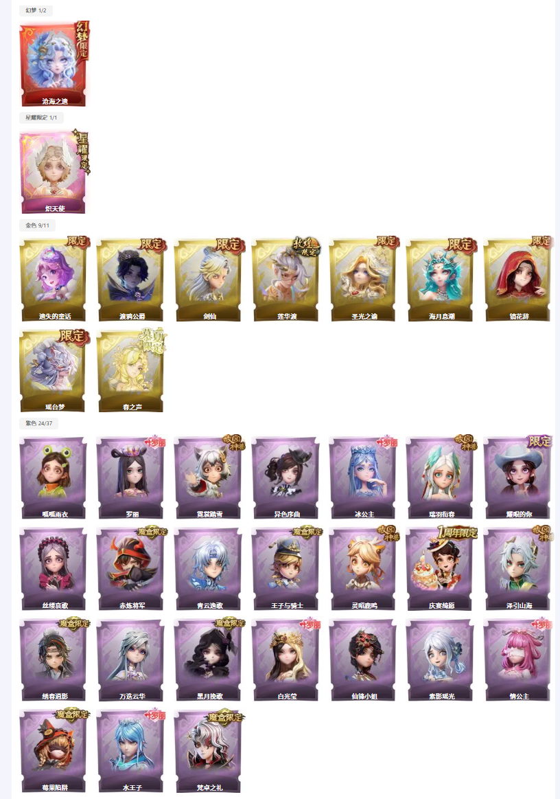 金色皮肤:9 紫色皮肤:24 是否有兔宝:否 道具皮肤:99