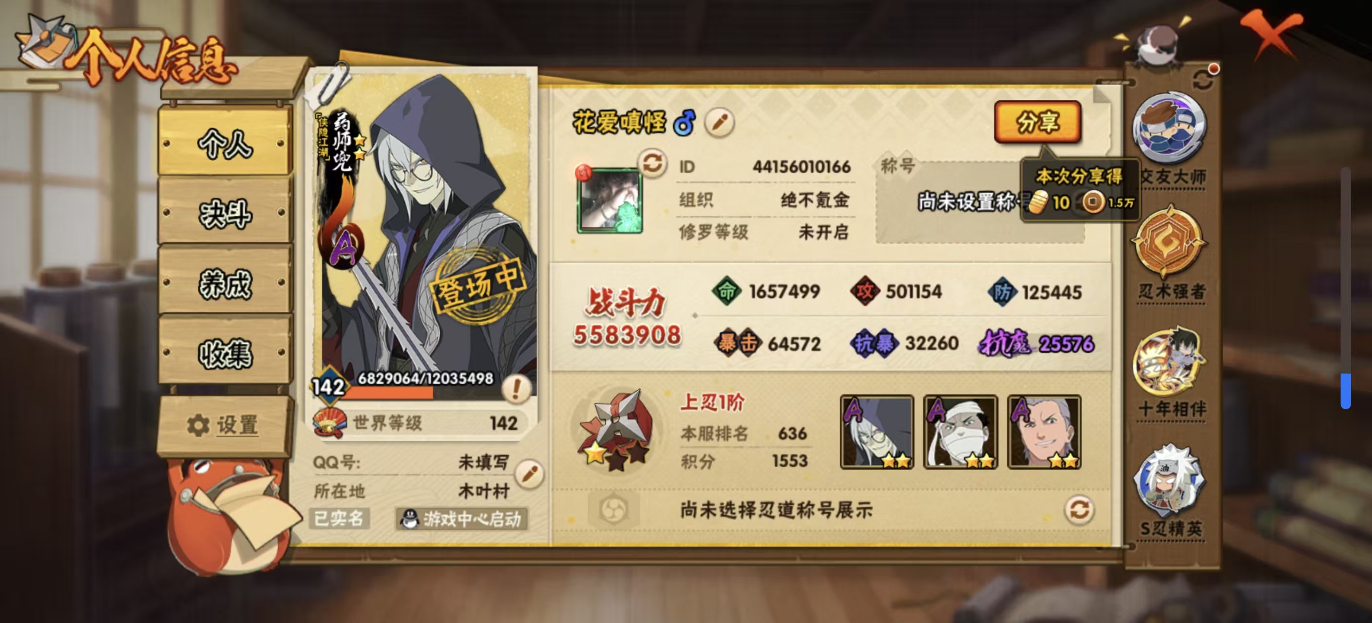 适配系统:安卓 账号类型(腾讯):QQ 战力值:550W 分销起租时长:1 A忍者数量:39 S级忍者数:14